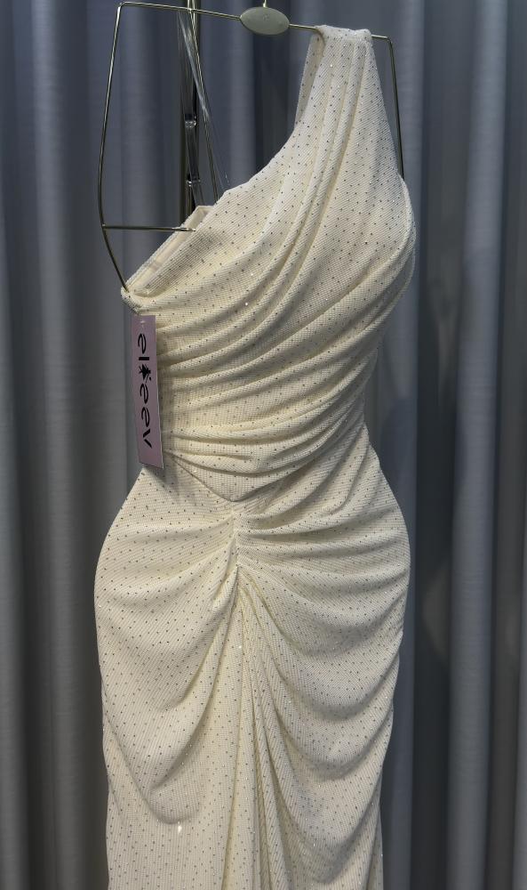 فستان طويل بلون أبيض مائل للكريمي، ذو تصميم عصري مع تفاصيل درابية تنساب برشاقة على الجسم. مصمم بأقمشة ذات لمسات لامعة تزيد من تألقك، ويتميز بكتف واحد أنيق يعكس الأنوثة والجاذبية