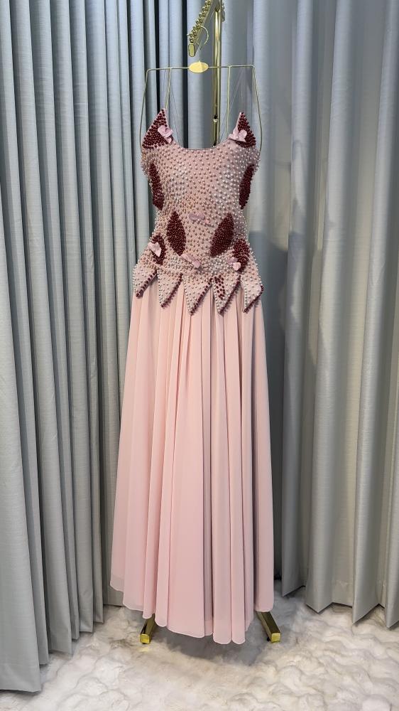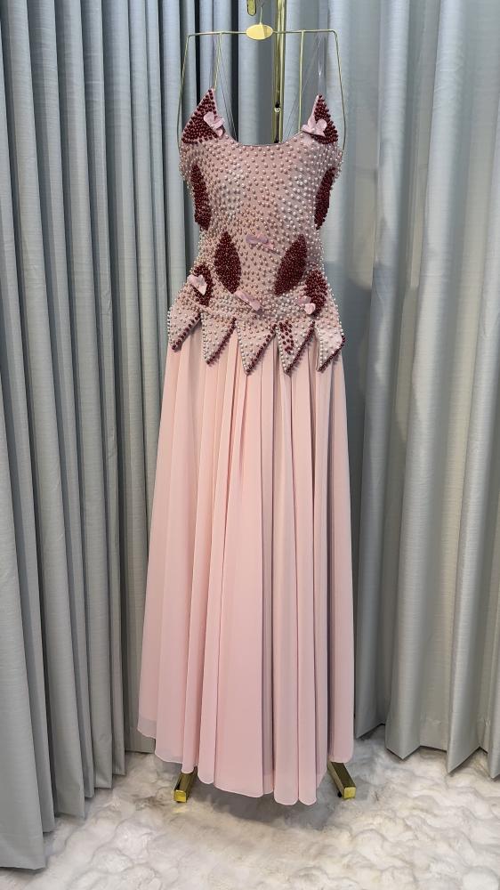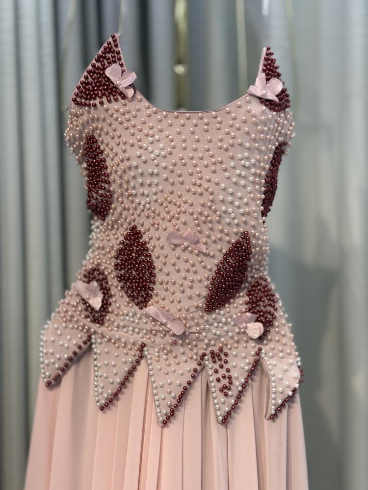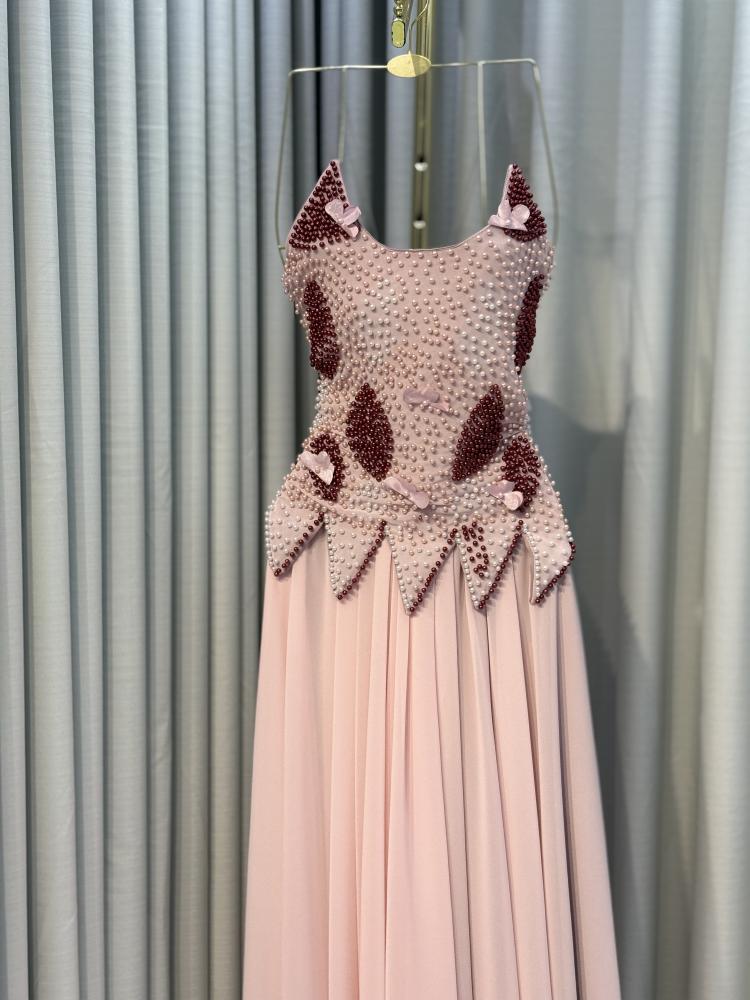 فستان فخم بلون وردي هادئ مزين بأحجار كريستالية لامعة وأشكال مميزة، مع تفاصيل صغيرة من الورود الوردية الجذابة.