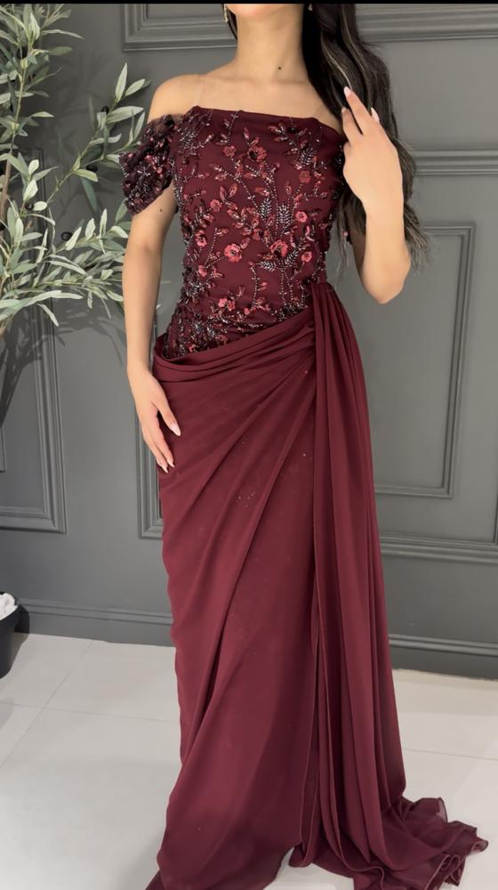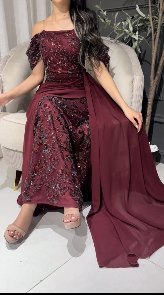 فستان سهرة بورغندي أوف شولدر مطرز بالورود مع درابيه أنيق، مثالي للمناسبات. نسّقيه مع كلتش ذهبي وأقراط كريستال لإطلالة ملكية