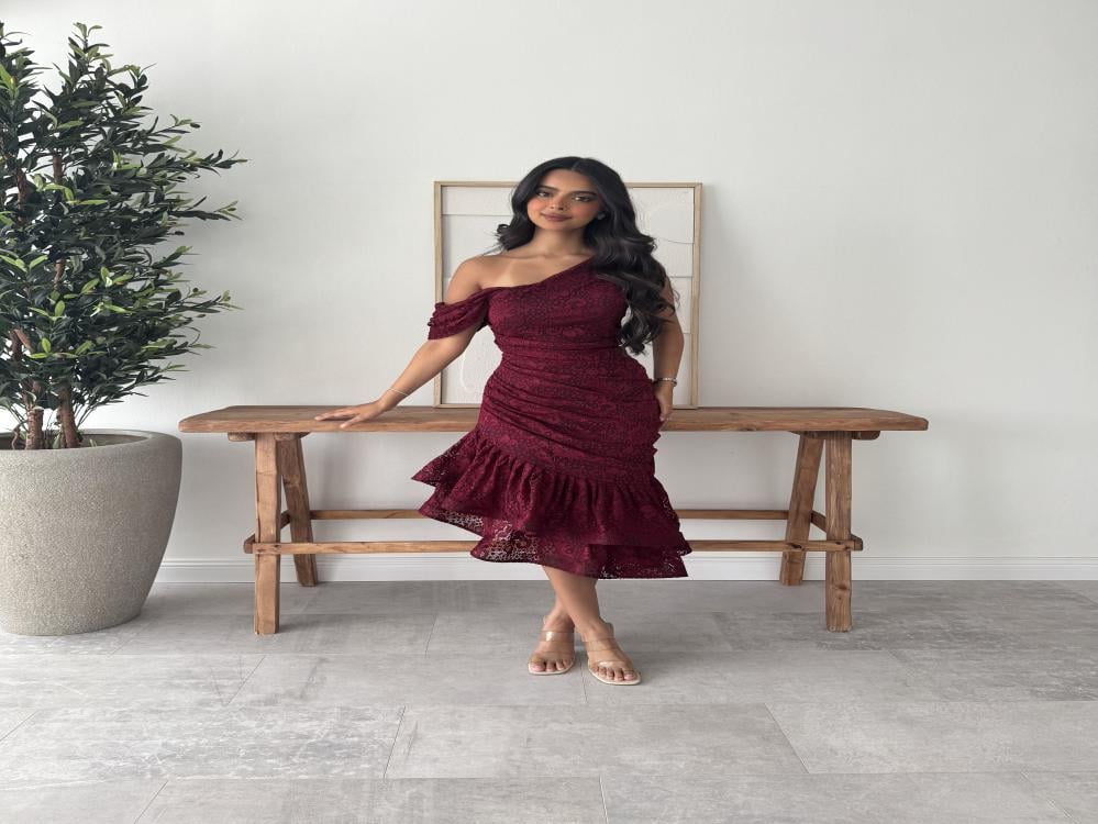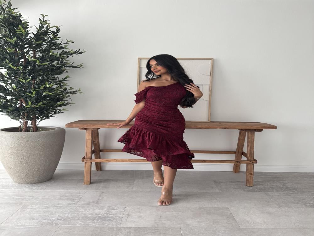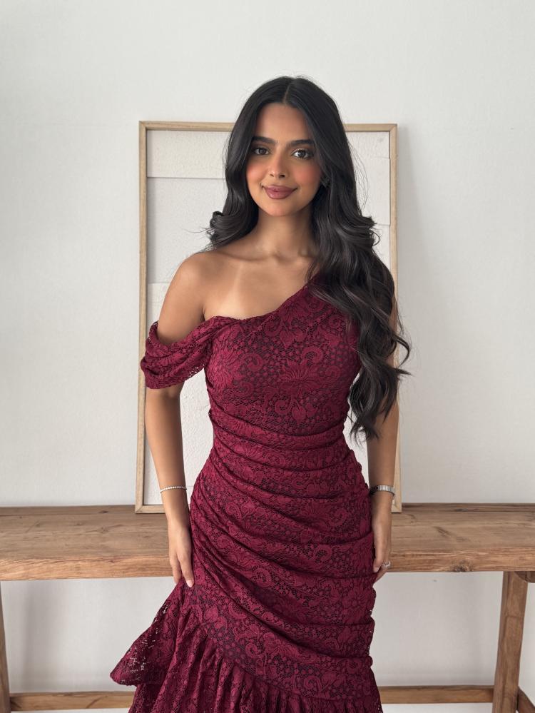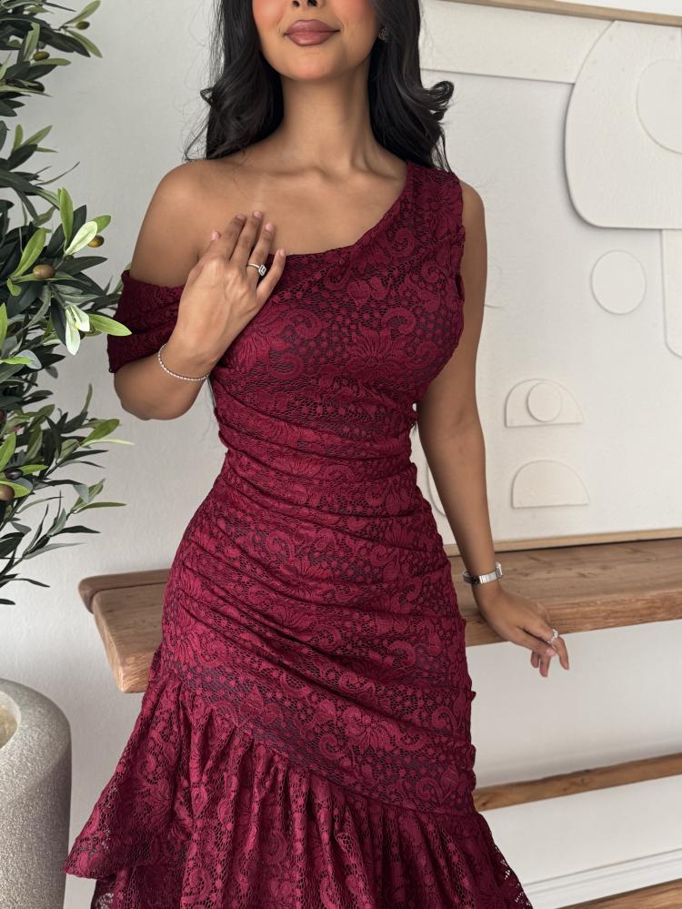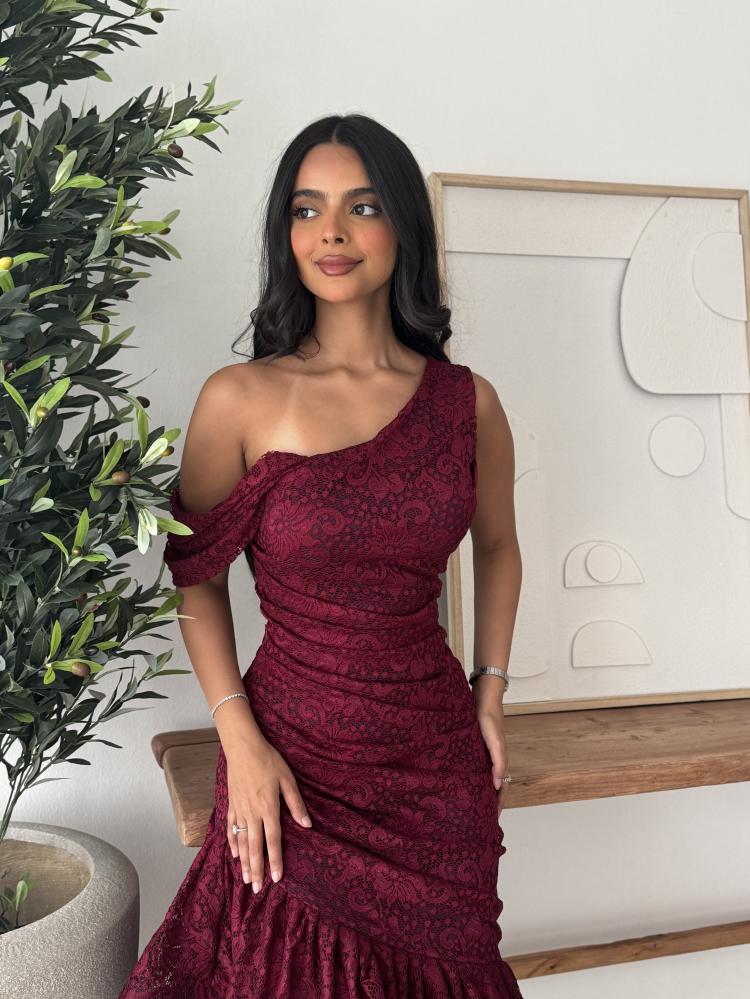 فستان دانتيل بورغندي فاخر بكتف واحد، بتصميم أنثوي جذاب يناسب الحفلات والمناسبات الخاصة. يمكن تنسيقه مع أقراط لامعة، سوار فضي، وحقيبة كلاتش صغيرة لإطلالة متكاملة وملفتة