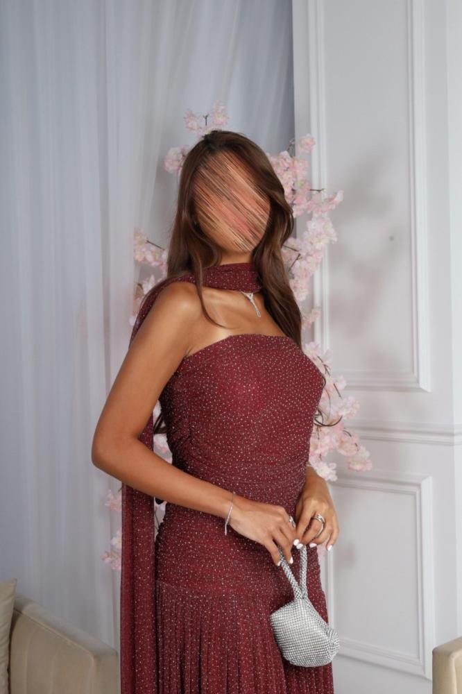 فستان سهرة خمري براق بتصميم أنيق مع شال كتف ناعم. مثالي للمناسبات الفاخرة مع حقيبة كريستالية، أقراط فضية، وكعب معدني فضي لزيادة التألق