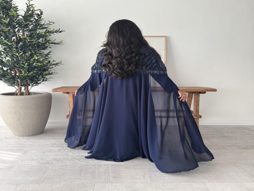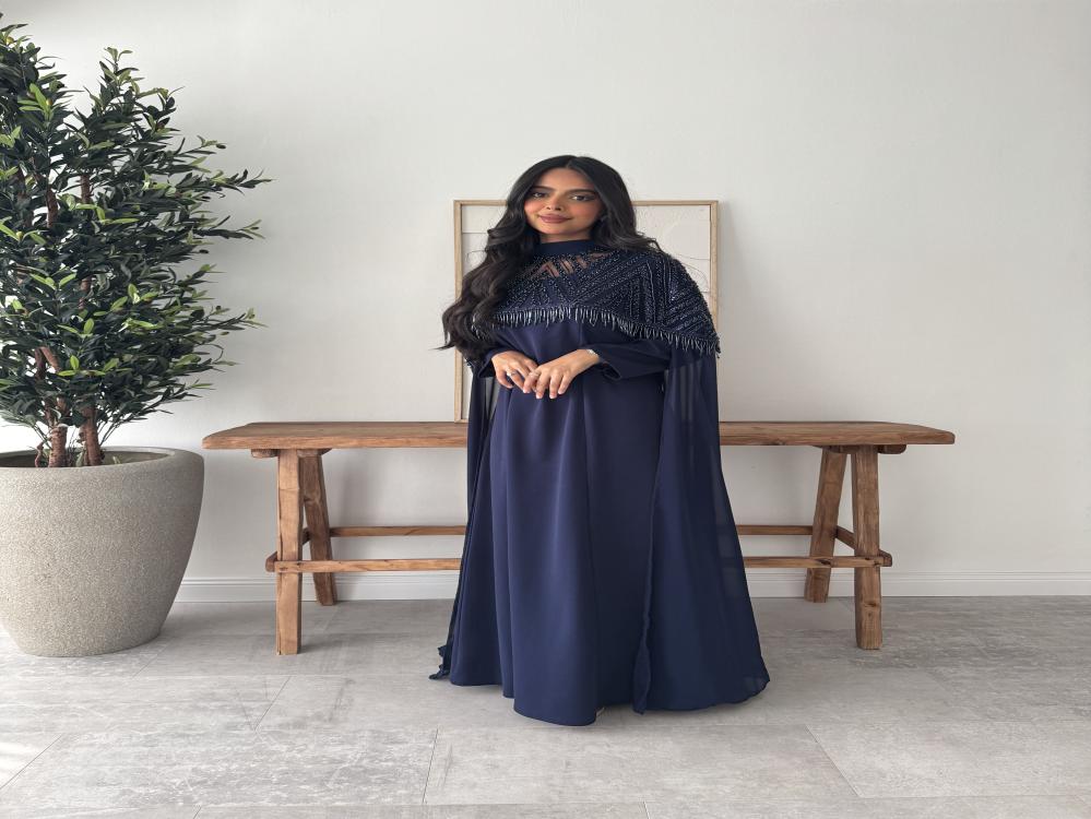 تميزي بإطلالة راقية مع فستانكحلي فاخرة بتطريز لامع، تجمع بين الأناقة والاحتشام، مثالية مع اكسسوارات فضية أو ذهبية لإطلالة راقية في المناسبات