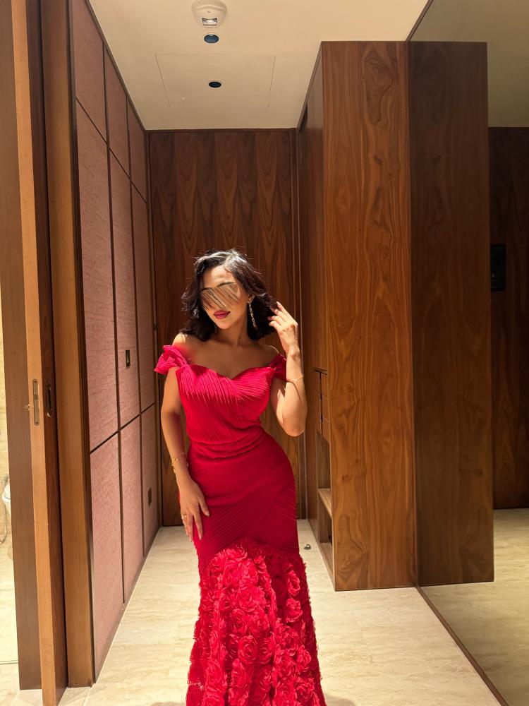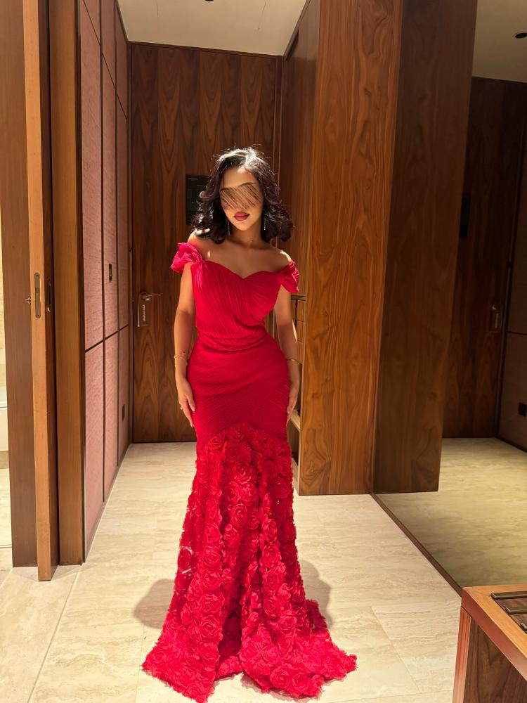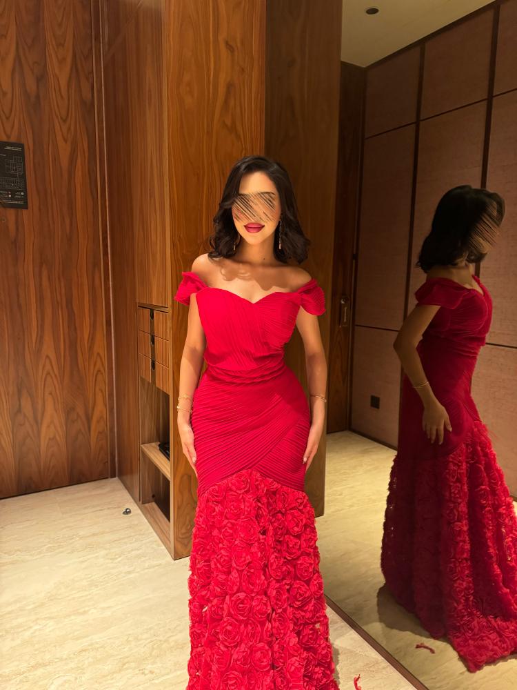 تألقي مع فستان سهرة أحمر أوف شولدر بتصميم فاخر مزين بالورود، مثالي للسهرات والمناسبات الخاصة مع اكسسوارات ذهبية أو فضية.